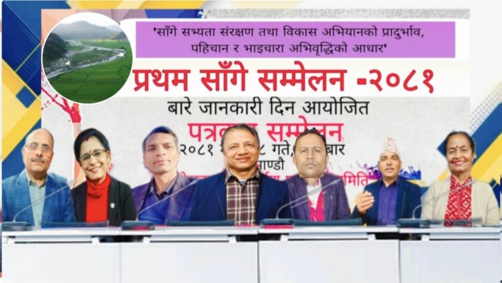 काठमाडौं, माघ २९ – साँगे सभ्यताको ऐतिहासिक महत्त्वलाई उजागर गर्दै समुदायलाई एकताबद्ध गर्ने अभिप्रायका साथ आगामी फाल्गुण ३ गते प्रथम साँगे सम्मेलन २०८१ आयोजना गरिने भएको छ। साँगे दर्पण प्रकाशन समितिको संयोजनमा भर्चुअल माध्यमबाट यस सम्मेलन हुन लागेको हो । माघ २८ गते काठमाण्डौमा पत्रकार सम्मेलन आयोजना गरि साँगे सम्मेलनमा ‘साँगे सभ्यता संरक्षण तथा विकास अभियान’ को औपचारिक घोषणा गरिने कार्यक्रम रहेको पनि जानकारी गराईएको छ ।